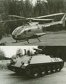 The HOT missile system demonstrated on different platforms: MBB Bo 105 light helicopter and the tracked Raketenjagdpanzer 1 armoured tank destroyer.