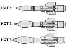 The HOT (French: Haut subsonique Optiquement Téléguidé Tiré d'un Tube, or High Subsonic, Optical, Remote-Guided, Tube-Launched)[1] is a second-generation long-range anti-tank missile system. It was originally developed to replace the older SS.11 wire guided missile in French and West German service. The design was a collaboration between the German firm Bölkow and the French firm Nord. Bölkow and Nord later merged into MBB and Aérospatiale respectively, both of which then formed Euromissile to design and produce the MILAN, Roland and HOT. This ultimately became part of MBDA.