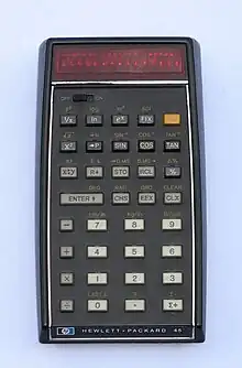 The HP-45 is the second scientific pocket calculator introduced by Hewlett-Packard, adding to the features of the HP-35. It was introduced in 1973[1] with an MSRP of US$395[2] (equivalent to $2,604 in 2022).[3] Especially noteworthy was its pioneering addition of a shift key that gave other keys alternate functions.