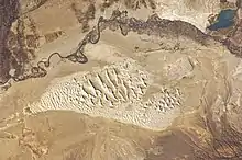 A satellite photo of the Irtysh River in the southeastern part of Habahe County and the southwestern part of Burqin County, and a desert south of it