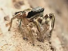 Habronattus mexicanus is a small brown jumping spider. The male and female are generally similar in size and appearance. It is distinguished by the iridescent scales on its Clypeus and more scales evenly distributed on its chelicerae. At the end of the pedipalp, the palpal bulb of the male spider has an embolus that sticks out at 200 degrees.[1] The spiders undertake complex vibatory song patterns as part of their courtship, which is one of the most complicated sexual displays amongst all animals.[2]