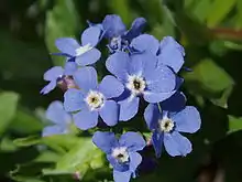 Atop the stems are cyme inflorescences of bright blue to lavender flowers. Each small tubular flower has five lobes with a petallike appendage at the base of each.