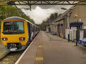 The town is served by Hadfield and Dinting railway stations, on the Glossop line. Hadfield is the terminus, with most trains running first to Glossop and then reversing back through Dinting towards Manchester Piccadilly. Services are operated by Northern Trains.[8]