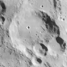 Hagecius is a lunar impact crater in the southeastern part of the Moon's near side. It was named after 16th century Czech naturalist Tadeáš Hájek (Latinized as Thaddaeus Hagecius).[1] This crater forms a triangular formation with the craters Rosenberger to the north-northwest and Nearch to the west-northwest. Like both of these craters, Hagecius has undergone erosion from subsequent impacts, and its outer rim is worn and irregular. The southeastern rim in particular is overlaid by three smaller craters designated Hagecius C, B, and G.