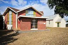 Hagley's population increased significantly during the 1850s as people moved both to the village, and to farming properties in the district.[14] A doctor was practicing in the area by 1854,[15] and in 1855 a school opened in the Church of England; paid for with funds raised by local residents.[18] That year a postal service began in Hagley. David Parry was appointed postmaster on 1 July 1855, probably operating an unofficial post office from the Hagley Inn. A post office officially opened on 10 June 1865, in a building that was demolished in 1970. This building also had a store called the "six day store" run by the postmaster and his wife.[19] The town gained a second hotel in 1857 with Carmody's Meander Hotel,[20] though this remained open for only a few years.[21] In 1857 also the town's first community organisation was formed, the Hagley Ploughing Association, and regular ploughing matches began.[22] A second church was built, a Methodist Chapel on the Westbury road, in 1859.[14]