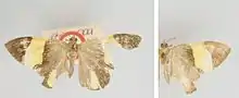 Both H. ephestris and related H. discordata show a pronounced yellow blotch on the hindwings that is absent in H. luteoradiata. Different from H. discordata, the yellow transversal band on the forewing of H. ephestris reaches the outer margin of the wing. Moreover, the band is broader than in H. discordata, whereas the yellow field of the hindwing is narrower, particularly in the proximate half of the wing.[1]