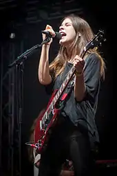 The group has rejected the "girl band" label, preferring to be respected as musicians on their individual merits. Alana stated, "When people call us a girl band, I take it as an insult – being a girl in a band shouldn't be a thing."[45] All three sisters are proficient on more than one instrument: Este plays both guitar and bass, Danielle plays guitar and drums, and Alana plays guitar, keyboards and percussion.[17] For live performances, Este plays bass, Danielle plays lead guitar and sings lead vocals, and Alana plays rhythm guitar along with keyboards and percussion. All three sisters contribute three part vocal harmony.[6][17] As the lead singer, Danielle's contralto vocals have been described as "rich" and "earthy".[110][111][112][113] Elaina Crockett of The Daily Orange has described all three members as altos, observing that they rarely sing beyond this range.[114]
