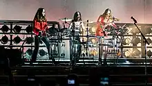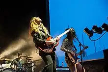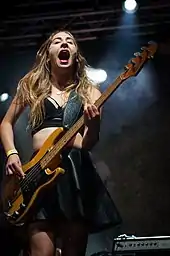 The band's live sound differs from that in the studio. Writing for NME, Hazel Sheffield said that Days Are Gone "may confuse those won over by their raw, rocking live shows."[37] Recordings demonstrate the group's vocal pop style, while the group plays typical rock material such as Fleetwood Mac's "Oh Well" in concert.[16] The group's background in wedding bands from their days as Rockinhaim has led them to cover many different songs live and for radio sessions, including Miley Cyrus' "Wrecking Ball", Sheryl Crow's "Strong Enough" and the Strokes' "I'll Try Anything Once" (an early version of "You Only Live Once").[115][116] Este acts as the group's MC onstage, announcing most of the songs.[16] Many of her on-stage antics, such as her blunt and coarse banter with the audience, frequent illeism and her facial expressions (known as the "bass face") while playing, are staples of the band's live shows and, to a lesser extent, the band's public image.[9]