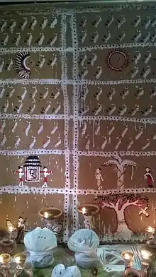 The airos make sun, moon, birds and palanquins on a bamboo screen and paint auspicious symbols on earthen lamps and pottery.