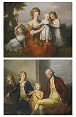 Joseph May (1730-1796) was a wealthy merchant who owned a wine factory in Lisbon.[14] In 1764 he married Mary Coppendale (1745-1824) who was the daughter of John Coppendale, a fellow wine merchant in Portugal. The couple had ten children. After they bought Hale Park in 1776 they commissioned the famous architect Henry Holland to remodel the house. Joseph became very proud of his house and in 1780 he asked Angelica Kauffmann, a well-known artist of her time to paint two pictures of the family at Hale Park. These are shown. They were probably commissioned to hang in their recently refurbished house.