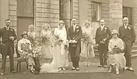 In 1920 Hale Park was sold to Major Ernest Beresford Fitzherbert Wright (1875-1942) who was the owner until about 1926. He had married Lucy Adeline Fox in 1899 and the couple had five children. Their daughter Rosemary married Alfred Reginald Claude Kirby in 1925 at Hale Park. A photo is shown of the wedding party at the front of the house near the steps. Major Wright and his wife Lucy are on the extreme left of the group.