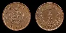 Half sen coins along with twelve other denominations were adopted by the Meiji government in an act signed on June 27, 1871.[4] This new coinage gave Japan a western style decimal system which was based on units of yen, sen, and rin.[5][6] Each half sen coin was authorized to weigh 55 grains (3.56 g) struck in a copper alloy.[5][7] The first coins minted are dated 1870 (year 3), but these were intended as trial strikes or pattern coins. Circulating coins were officially minted starting in 1873 (year 6) with a newly adopted design which eliminated a sunburst previously used on the reverse.[5][8] All of these coins have the value written in both Arabic and Kanji on opposing sides. The obverse features a dragon with the date of reign, while the reverse has a wreath with a Chrysanthemum seal located above. The half sen was legal tender only up to the amount of 1 yen which was fixed by government regulations.[9] Production of half sen coins continued with the exception of 1878 (year 11) for every year until 1888 (year 21). It is possible that non circulating half sen coins were made again in 1892 (year 25) for display at the World's Columbian Exposition.[lower-alpha 1] Coins with a value of one-two-hundredth of a yen were not mentioned again until the Japanese government went on the gold standard in 1897.[10] The half sen coin was later replaced for a brief time by another coin with the same value in the late 1910s. Half sen coins were eventually demonetized at the end of 1953 when the Japanese government passed a law abolishing subsidiary coinage in favor of the yen.[11]