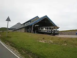 The Halfway tram stop is a tram stop situated at the midpoint of the Great Orme Tramway on the slopes of the Great Orme in Llandudno, Wales. The Great Orme Tramway operates as a two-section funicular, and passengers must change at Halfway between the lower section (to and from the Victoria stop) and the upper section (to and from the Summit stop). The stop is also convenient for the nearby Bronze Age Copper Mines.[1][2]