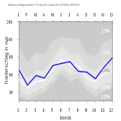 Due to its location in the subatlantic oceanic climate a year-round humid climate with uniformly distributed precipitation prevails. At the weather station Brockhagen (belonging to Steinhagen (Westphalia)), situated just south of Halle, a yearly total of 775 mm precipitation is recorded on long-term average. Hence more precipitation than on German average is recorded, but considerably less than in a northern direction towards Halle. Due to the rain catching effect of the Teutoburg Forest orographic rainfall can amount to 1,200 mm per year.
