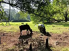 The mammals affected the environment. For example, the bushpigs which feed on roots, maggots, and insects helped to aerate the trees' root systems. The female giraffes feed on leaves and dispersed plants seeds while their faeces acted as fertiliser. The dung beetles also played a role by helping bring the manure underground where it is broken down by micro-organisms creating further plant life.