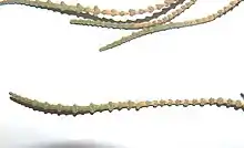 The genus Halocnemum was first published in 1819 by Friedrich August Marschall von Bieberstein,[2] at that time comprising two species, Halocnemum strobilaceum and Halocnemum caspicum (the latter is now a synonym of Halostachys belangeriana). Halocnemum strobilaceum was selected as the type species.[3] During the 19th century further species were added, later these were grouped into other genera or treated just as synonyms of Halocnemum strobilaceum. For many years the genus Halocnemum has been regarded as monotypic. In 2008, the new species Halocnemum yurdakulolii was discovered,[4] which was synonymized with Halocnemum cruciatum in 2012.[5]