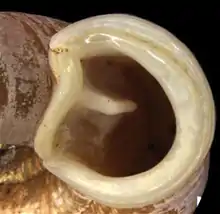 The apertural lip is well-developed.[2] The apertural fold is long, more or less equally long in its total length, connected to the callus.[2]