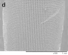 The radula of Halongella schlumbergeri has 10 lateral teeth and 14 marginal teeth.[2] The size of the central tooth is smaller than the ectocone of the first lateral.[2] The shape of the first lateral is oval.[2] Marginal teeth are bicuspid or tricuspid with blunt inner cusp and shallow incision between the inner two cusps.[2]