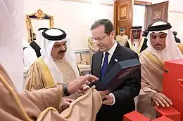 The king was invited by the British court to the wedding of Prince William, but declined amidst protests by human rights activists, who had pledged to disrupt his stay in Britain because of his violent response to demonstrators.[27] In August 2020, King Hamad explained to visiting U.S. Secretary of State Mike Pompeo that Bahrain is committed to the creation of a Palestinian state, implicitly rejecting the normalization of ties with Israel.[28] However, on 11 September 2020, it was announced that Bahrain and Israel had agreed to establish full diplomatic relations.[29] On 15 September 2020, Bahrain officially opened state to state relations with Israel, signing diplomatic agreements at a public ceremony at the White House in Washington, D.C.[30] On November 2, 2023, Bahrain expelled the Israeli ambassador and ceased economic ties in response to Israeli military action in Gaza and pervasive settler violence in the West Bank. [31]