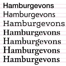 The word Hamburgevons (or Hamburgefonstiv or Hamburgefons) is a short piece of meaningless filler text used for assessing the design and the appearance of a typeface.[1][2] It contains all essential forms in a Latin alphabet, so that the character of the respective font can be recognized quickly.[3][4] It consists of the letters that are often first designed when designing a typeface.[4]