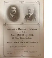 Hamilton & Inches was founded in 1866 on Princes Street in Edinburgh by Robert Inches and his uncle James Hamilton. On 1 June 1866 Hamilton & Inches registered their hallmark with the Edinburgh assay office.[2][6]