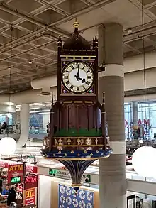 The historic 1930 clock formerly at Birks Building was located at the corner of James Street North and King Street West from 1986 to 2010. It has since been fully restored and relocated indoors at Farmers' Market. Every 15 minutes, the miniature knights joust as they rotate around the clock's base. The clock also chimes and plays music. The clock sounds very similar to a carillon.
