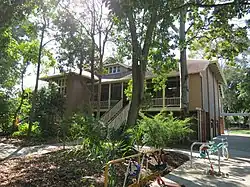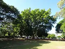 Arbor Day was celebrated at Hamilton State School from at least 1912. By 1925 there were 39 trees planted in the school grounds including: Weeping figs (Ficus benjamina), Moreton Bay chestnuts (Castanospermum australe), Cocos or Queen palms (Syagrus romanzoffiana), Macadamia nut trees (Macadamia integrifolia), Camphor laurels (Cinnamomum camphora) and Candlenut trees (Aleurites moluccanus).[42] Aerial photography dating from 1936 shows extensive tree planting along all boundary fences, except along the eastern half of the southern boundary.[43] In July 1941 a pergola over the front steps of the school building was completed at a cost of £4.[44][1]