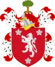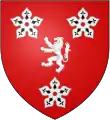 BlazonGules, a lion rampant, argent, betwixt three cinquefoils, ermine
