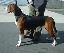 The breed is known by the white blaze on the head, down the neck, four white paws, and a white tail tip. It differs from an English Foxhound in that its frame is lighter.