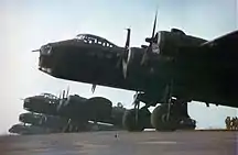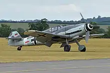 RAF Henlow was the film's base of operations for the restoration and modification of the Hurricanes and Spitfires, and it was here that the various marks of Spitfire were converted to resemble the 1940 variant.[21] Mahaddie's big coup was discovering that the Spanish Air Force was still using licence built Messerschmitt 109 fighters as trainers and Heinkel 111 bombers as transports, ironically both now powered using Rolls-Royce engines. He persuaded the Spanish air force to co-operate in the filming of Battle of Britain. This provided the film with its "Luftwaffe" aircraft.[19] All told he acquired the use of 115 British and German designed aircraft.[18]