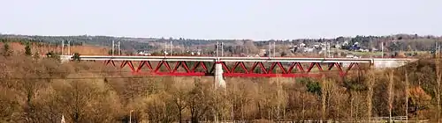 Invasion came again on 10 May 1940, the date on which, for Belgians, the Second World War broke out. On the night of 9/10 May Belgian troops blew up a section of the viaduct.[3] There have been suggestions that the soldiers involved used too much explosive, since ten of the twelve men who undertook the work were killed in the explosion.[3] Nevertheless, the German invasion went ahead, relying not so much on rail transport as on motor vehicles, and during more than four years of military occupation that ensued the German army were quickly[2] able to render the crossing usable again, using a truss bridge parallel to the remains of the viaduct, employing Russian prisoners of war accommodated at a prisoner camp nearby to provide the necessary labour.[3] The single track bridge proved insufficient, however, and work started on a parallel arrangement using truss bridge sections linking from the stubs of the destroyed viaduct to a massive concrete pillar placed on the valley floor between the two extremities.[4] The second bridge became operational in time for September 1944.[4] On 12 September 1944 the bridge was blown up again, this time by the retreating German army, keen to impede the advance of Anglo-American forces.[2]