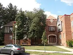 The nine buildings occupy an entire block and surround an oval-shaped common lawn. They are all two stories tall and follow a cross-shaped plan. Decorative elements in the Tudor revival style include half timbering, crenellated towers and entrances trimmed in carved stone. The exteriors of the buildings were designed by James E. Cooper and George T. Santmyers designed the interiors. Parks and Baxter served as the landscape architects.