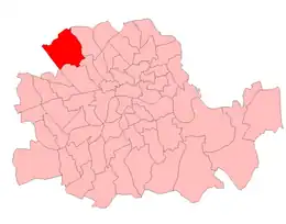 The parliamentary borough of Hampstead was created by the Redistribution of Seats Act 1885, and consisted of the civil parish of St John, Hampstead, Middlesex.[3] The parish had previously formed part of the Parliamentary County of Middlesex.[4] Hampstead lay within the area of the Metropolitan Board of Works, and in 1889 this became the County of London. In 1900 the county was divided into twenty-eight metropolitan boroughs, with the civil parish becoming the Metropolitan Borough of Hampstead.[4]