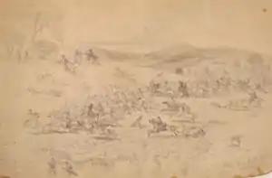 Appointed by Brigadier General Gregg as an inspector-general on the staff of the 1st Brigade on April 1, 1863,[7][9] Thomas participated with the brigade in Stoneman's 1863 raid and then, that summer, led his 1st Pennsylvania Cavalrymen and two companies of the 1st Maryland Cavalry in the recapture of Union artillery at Fleetwood Hill during the Battle of Brandy Station, Virginia on June 9 as Union forces engaged those of Confederate General J.E.B. Stuart.[10] In a memoir penned in 1889, Thomas recalled what happened that day:[11]