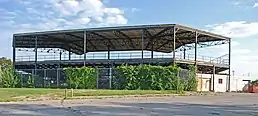 The steel frame of the grandstand is original.[2] Grandstand seating begins 6 feet (1.8 m) off the ground, and is accessed via three concrete ramps. The wooden bleacher seats sit on wooden deckes, which are supported by steel I-beams. The I-beam structure continues above the bleachers, and supports a corrugated metal roof. Chain link fences behind the bleachers and atop the roof protected cars from foul balls. As of 2012, a fencing surrounded the grandstand to deter vandals.[2] Although covered with graffiti, the structure is still in good shape.[9]