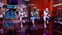 The final game mode in Kinect Star Wars is Galactic Dance-off. Here players control one of several famous Star Wars characters through the use of the Kinect. Gameplay is a combination of Dance Central series and Just Dance in which players must dance in synchronization with the on-screen character. Cues to upcoming dance moves are shown to the player to ensure they can stay in synchronization with the character. The song selection consists of parodies with title and lyrics rewritten in a Star Wars theme. For example, Gwen Stefani's "Hollaback Girl" is rewritten as "Hologram Girl", and Village People's "Y.M.C.A." is rewritten as "Empire Today", while Jason Derulo's "Ridin' Solo" is rewritten as "I'm Han Solo". Dance locales are themed to the character and a particular moment for them in the Star Wars saga story; for example, Princess Leia's dance takes place in front of Jabba the Hutt, and Han Solo's dance takes place in the carbon-freezing chamber on Bespin.[4]