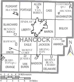 Hancock County was established on January 21, 1828, by the Ohio General Assembly from the southern portions of Wood County. Originally containing only Findlay Township, the county would add Amanda and Welfare (now Delaware) townships later in April of that year. Additional townships were laid out as follows: Jackson in 1829; Liberty and Marion in December 1830; Big Lick, Blanchard, and Van Buren in 1831; Washington, Union, and Eagle in 1832; Cass and Portage in 1833; Pleasant in 1835; Orange in 1836; Madison in 1840, and finally Allen in 1850. Originally nearly 24 miles square, Hancock County would lose some of its southeast portion in 1845 to the new Wyandot County.[5]