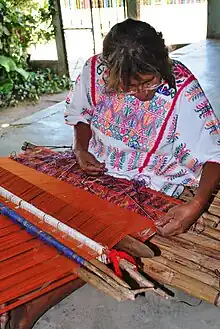 Many Mixtec, Amuzgo and Nahua women still wear traditional dress, often made with hand woven cloth, with the finished product hand-embroidered. The main communities for this activity include Tlacoachistlahuaca, Xochistlahuaca, Yoloxochily, Huahuetónoc and Acatlán (Chilapa municipality). Both weaving patterns and embroidery designs can be intricate and adorn items such as blouses, shirts, pants and robes.[8][7] The most distinctive indigenous clothing garment is the huipil (a kind of loose blouse or dress), which is produced by several cultures, such as the Mixtec, Tlapanec and Amuzgo. Backstrap looms are used in Mixtec and Tlapaneca communities to make sarapes and gabanes (a kind of overcoat) which are somewhat crude, dyed with natural or commercial dyes in contrasting patterns. Another distinctive garment is the enredo nahuatl (a kind of wrap belt), made of cotton dyed blue with three white stripes, over which there is embroidery with floral, religious, patriotic human and animal motifs. The community best known for this work is Acatlán.[8][2]