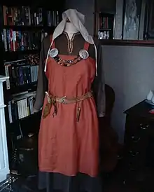 The hangerok (sometimes spelled hangerock or hangeroc) was a type of dress worn by Viking women and some other early medieval northern European cultures. The garment was shaped somewhat like a pinafore, with two straps over the shoulders secured by brooches. It would usually be worn over a tunic-dress called a særk or a kirtle (underdress).[1][2][3][4][5][6][7][8]
