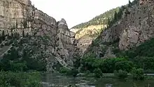 Hanging Lake is a lake in the U.S. State of Colorado. It is located in Glenwood Canyon, about 7 miles (11 km) east of Glenwood Springs, Colorado and is a popular tourist destination. When open, the lake is reached via a trailhead located along the Glenwood Canyon Bike and Pedestrian Path that runs along the north side of I-70 in the bottom of the canyon. The trail follows Dead Horse Creek, a tributary of the Colorado River and ascends some 1,000 feet (300 m) in elevation for 1.2 miles (1.9 km) from the trailhead to the lake.[2]