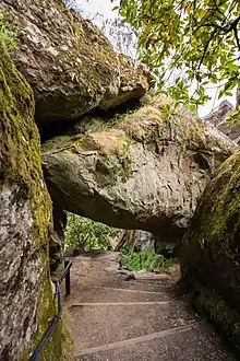 The 'Hanging Rock' over the path up to the summit that gives the site as a whole its name.