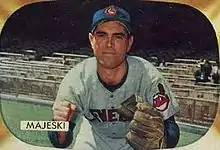 A year later, his contract was purchased by the Cleveland Indians where he served as a utility infielder behind Al Rosen, and helped tutor a young Bobby Ávila.[24] Majeski helped the Indians win the 1954 American League Pennant, batting .281 with only 3 errors while backing up Rosen at third base and filling in as a second baseman when Avila was injured.[25] He also hit a pinch hit three-run home run in Game 4 of the 1954 World Series in a losing cause against the New York Giants.[26] He was traded to the Baltimore Orioles in June 1955, and then retired as a player at the end of the season at the age of 38.[22]