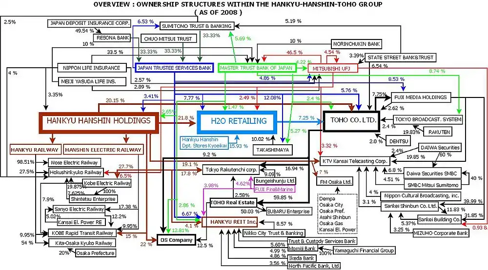 Rough overview of the ownership relations prevailing within the Hankyu Hanshin Toho Group. Fully owned subsidiaries are not taken into account. Ownership information taken from company statements as of 2008.
