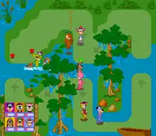 During each race, the player is able to collect power-up crystals scattered across the course, bestowing advantages or hinder the players, including a rain cloud that can be passed to another player.[1][2][3][4] The character can be customized by collecting white crystals that lie on the track, and the player can exchange them for better acceleration, higher top speed, improved grip, or more turbo energy.[1][2][3][4] The players collide with each other and can stun their characters by jumping on them.[1][2][4] Each track also has their own obstacles such as lakes or the appearance of other Hanna-Barbera characters.[1][2][3] Up to five players can participate simultaneously using the Super Multitap.[1][2][3][4]