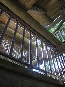 In 1938, the Civilian Conservation Corps (CCC) constructed a new watch tower at the site where Robinson watched over Boston Neck. The new tower, 100 feet (30 m) high was made of wood and raised with pillars. The tower was used during World War II as an observation tower.[4] The height of the tower overlooked the Atlantic Ocean and Narragansett Bay on clear afternoons,[3] and the former cube-shaped rock that Robinson sat on, remains on the former McSparran farm, which was sold by its owner in 1966 to the state. The land 1.52 acres of land became a preserved area, including both the rock and the tower in memorial to Hannah Robinson.[1] In 1988, the state rebuilt the tower using the original structure's pillars and remains standing, at 40 feet (12 m) high[4] and four stories tall.[3]