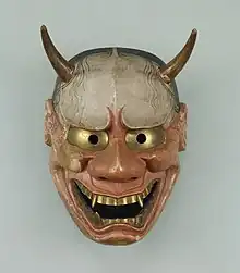 The hannya (般若) is a mask used in Japanese Noh theater, representing a jealous female demon. It is characterized by two sharp bull-like horns, metallic eyes, and a leering mouth.[1] In Noh plays, the type of mask changes according to the degree of jealousy, resentment, and anger of the female characters. The hannya is a mask that represents a female onryō (怨霊, vengeful spirit) even more resentful, jealous, and angry than the namanari (生成), a woman on the verge of becoming a demoness.[2][3]