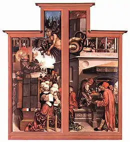 - from a St. John Triptych, right wing inside: John the Evangelist in Boiling Oil, 1514, wood, 125×75 cm, Basel, Kunstmuseum