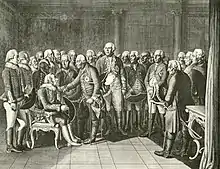 On 26 January 1786, Zieten died in his bed in Berlin, a remarkable age considering his hair-trigger temper and his reputed 74 duels.[11] He was buried on 31 January 1786 on the Wustrau cemetery next to the village church. His estate was valued at 65,057 thalers. Apart from property at Wustrau, he left no fortune. The furniture of the Berlin house had to be auctioned after his death, and his widow was only freed from debt by a gift from King Frederick of ten thousand thalers.[2]