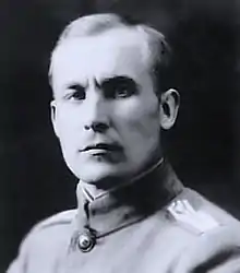 Kalm's battalion became infamous in March as they attacked a Red Guard sanatorium in the village of Harmoinen in Kuhmoinen municipality, killing 11 wounded soldiers and two nurses.[2] After the Battle of Lahti, his battalion was in charge of the Hennala camp. In a short period in May, more than 500 Red prisoners were executed, including some 200 female fighters.[3] The youngest of the latter ones were only 14-year-old. It is most likely that Kalm himself shot the Red leader Ali Aaltonen.[4]