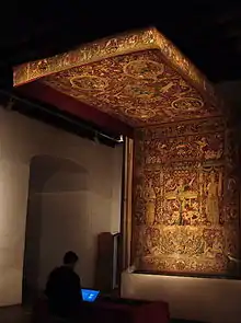 When this series was completed in 1585, the king commissioned Knieper to make the Throne Baldaquin. The Throne Baldaquin was made of 8 separate tapestry pieces which were woven with silver, gold and silk. It was intended to hang above the heads of the king and queen when they sat at the head of the banquet table.[4] Its rich materials and distinguished and refined style make it probably Northern Europe's most beautiful piece of fabric. It was completed in 1586 and was in 1659 taken by the Swedes as war loot after they sacked Kronborg. It remained in the Swedish royal family until after Karl XV's death it was transferred to the State and is now in the Nationalmuseum in Stockholm.[5]